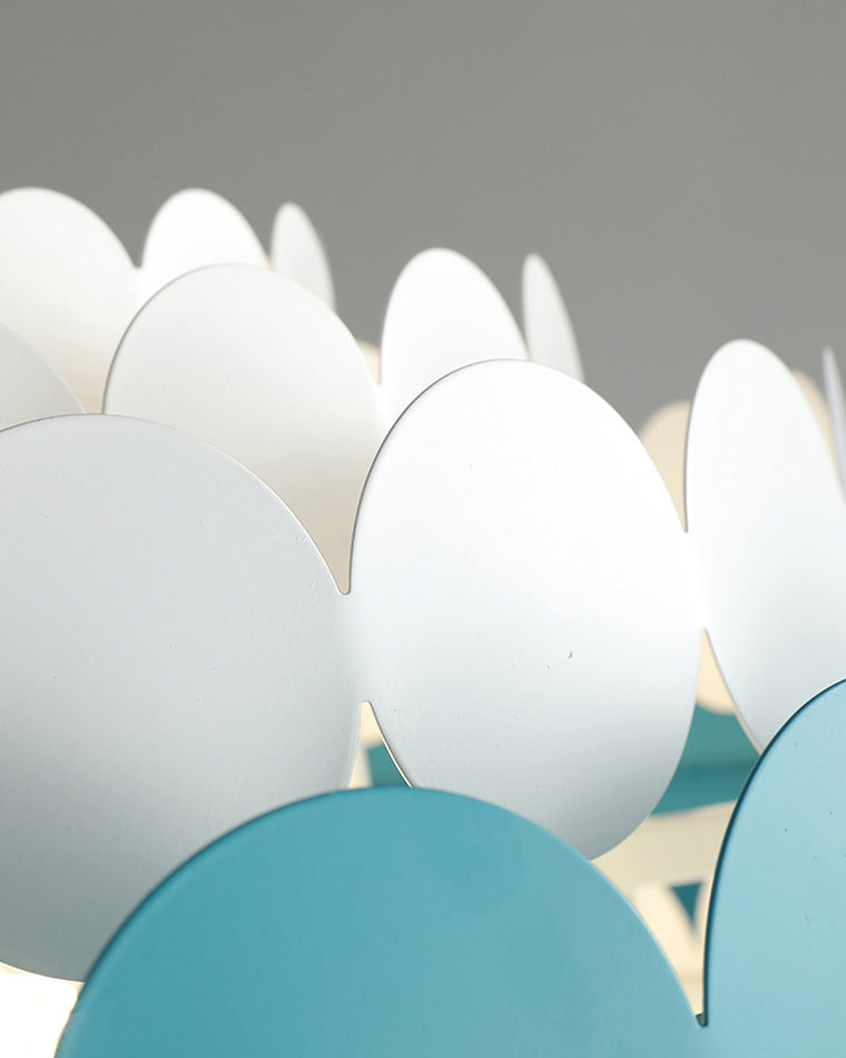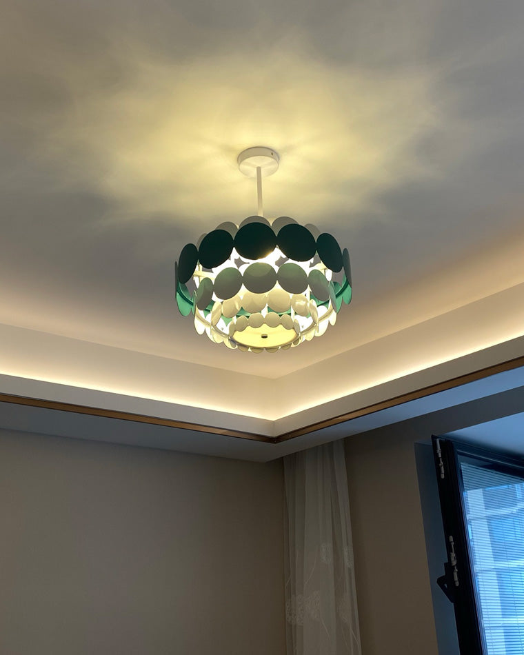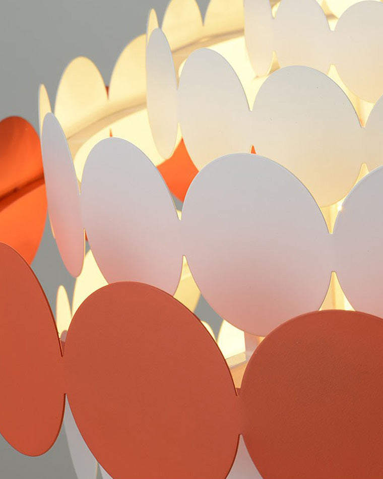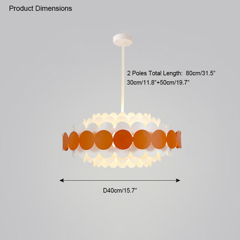 Make a statement with the mid-century modern style of the Metal hanging lamp. 7 layers of white and colorful painted metal (iron) discs strung together as a lampshade. With the contrast of color, this decorative light fixture is perfect for transforming any indoor space such as a restaurant, kitchen, dining room, living room, bedroom or foyer.