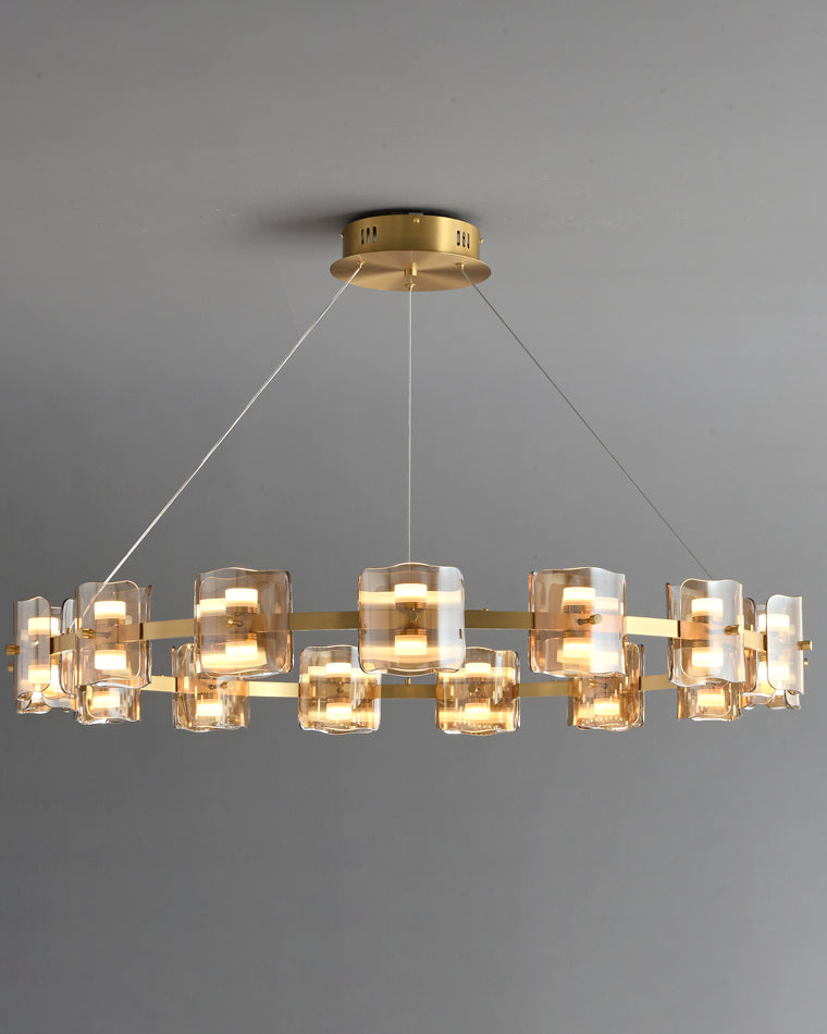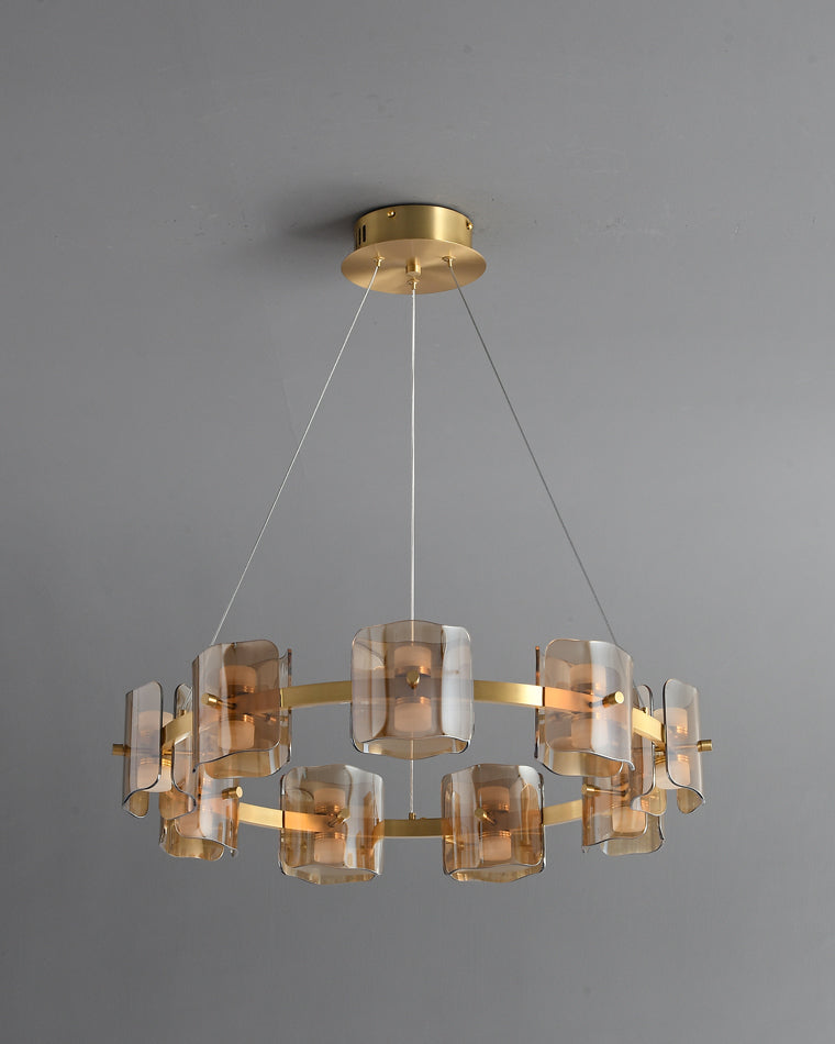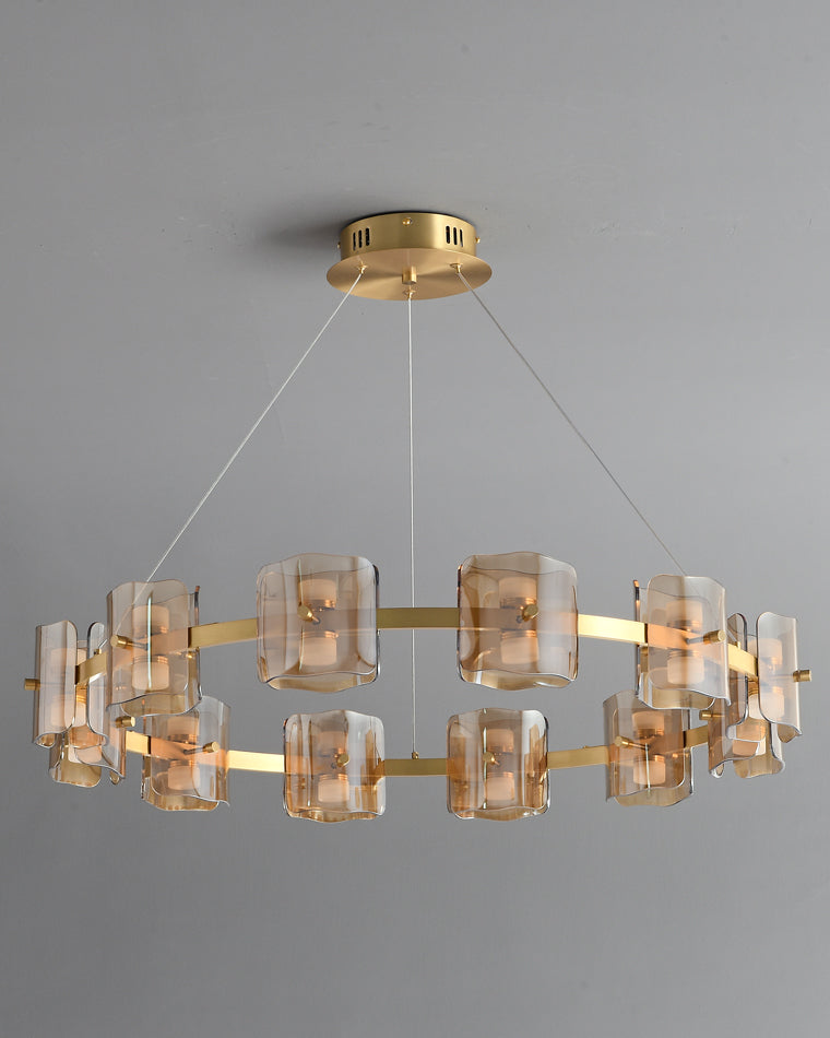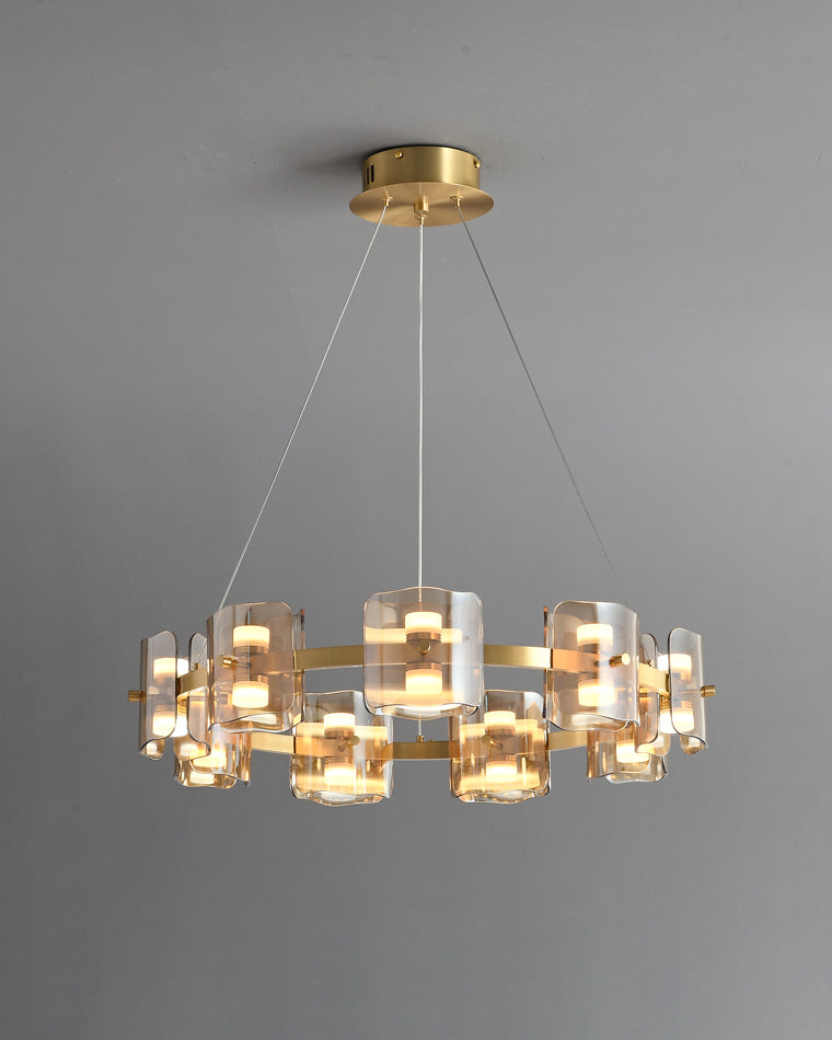 The circular brass/copper frame is evenly distributed with multiple LED light sources, each wrapped in two tiles of smoked glass or amber glass, which makes the light visually comfort,. With this gold and black modern design, the lamp brings a sophisticated and elegant atmosphere to your living room, bedroom or dining room.