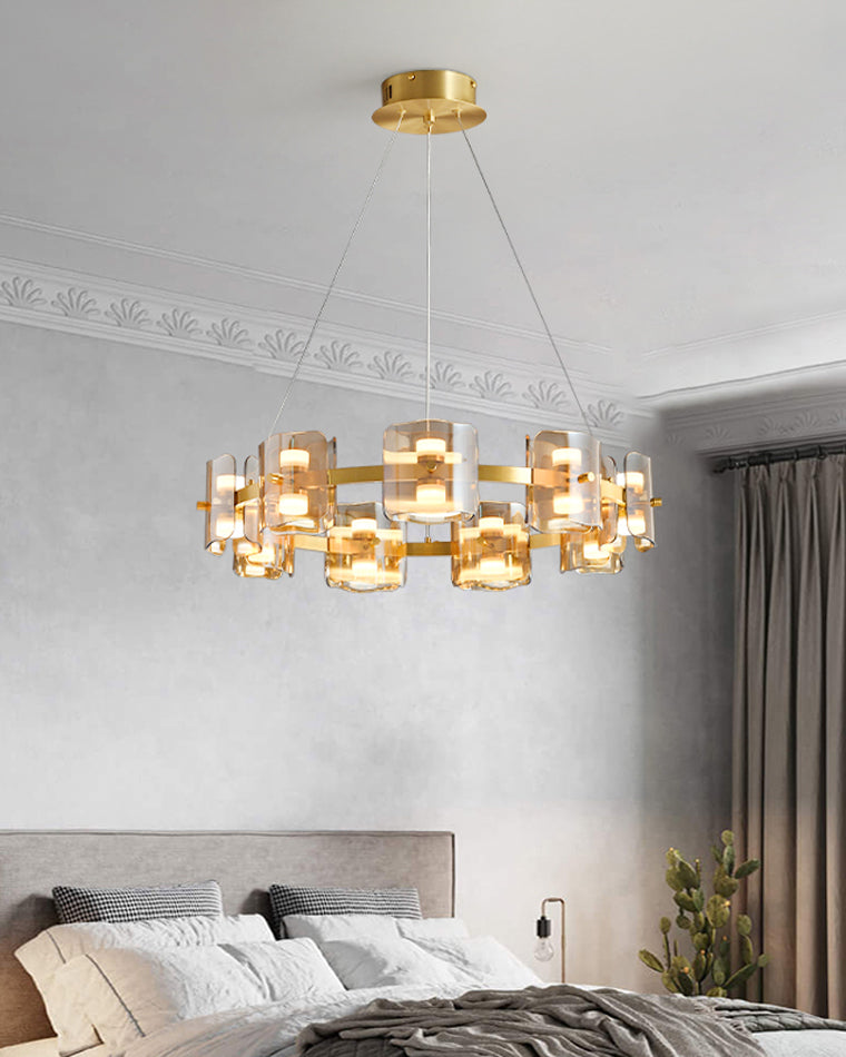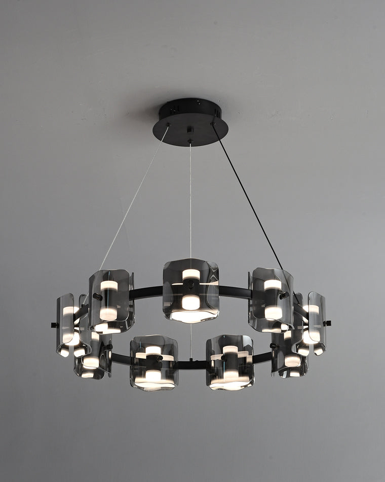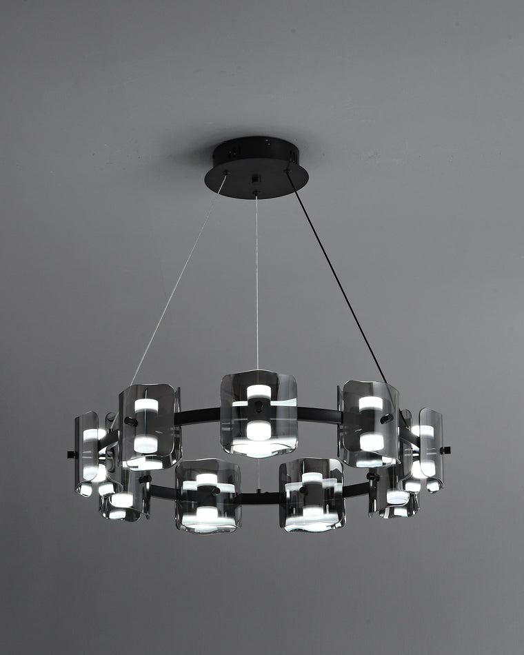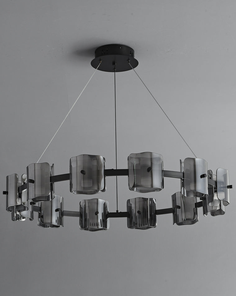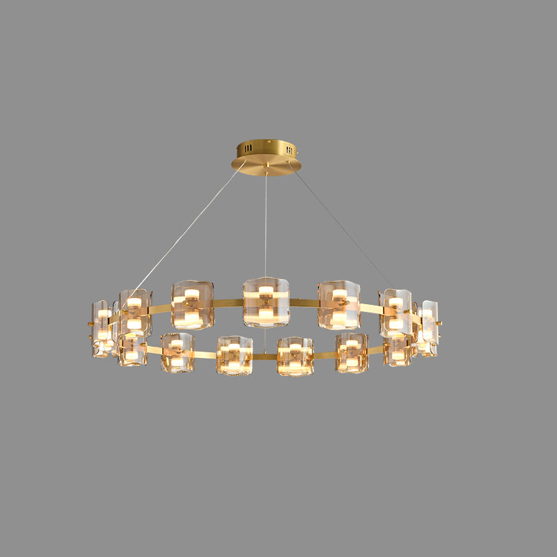 The circular brass/copper frame is evenly distributed with multiple LED light sources, each wrapped in two tiles of smoked glass or amber glass, which makes the light visually comfort,. With this gold and black modern design, the lamp brings a sophisticated and elegant atmosphere to your living room, bedroom or dining room.