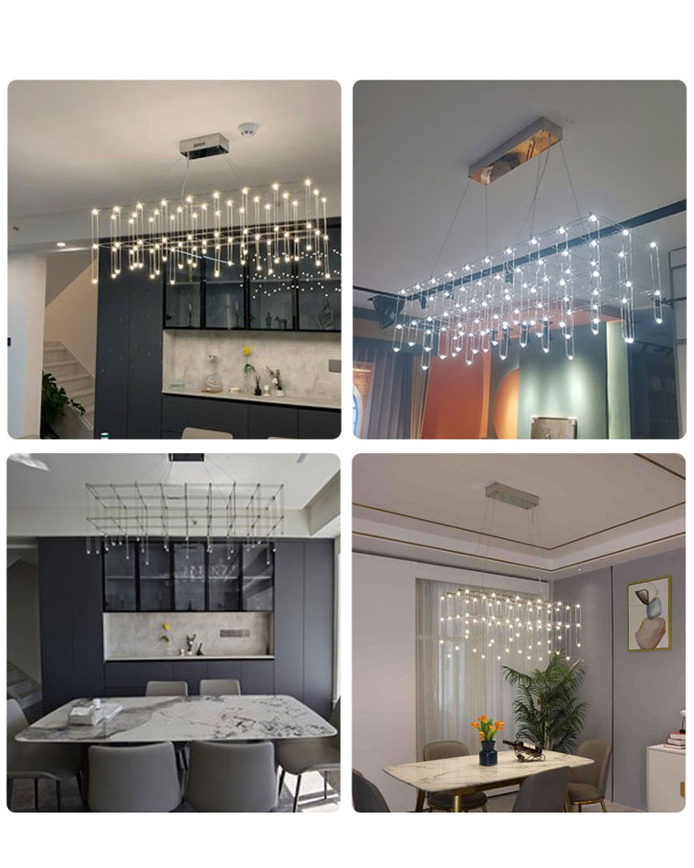 The Rectangular Sculptural Pendant Lamp is a pendant light with black rosette and cover matching the structure. The quadrangular lamp body is structured by a series of painted tubular rods anchored to each other. The light sources fixed to the supporting structure are of the LED type. With the illuminating drops falling out of the Universe, this modular version of the Universe becomes modern and frivolous by playing with heights. Enjoy a majestic atmosphere by hanging over you kitchen island!