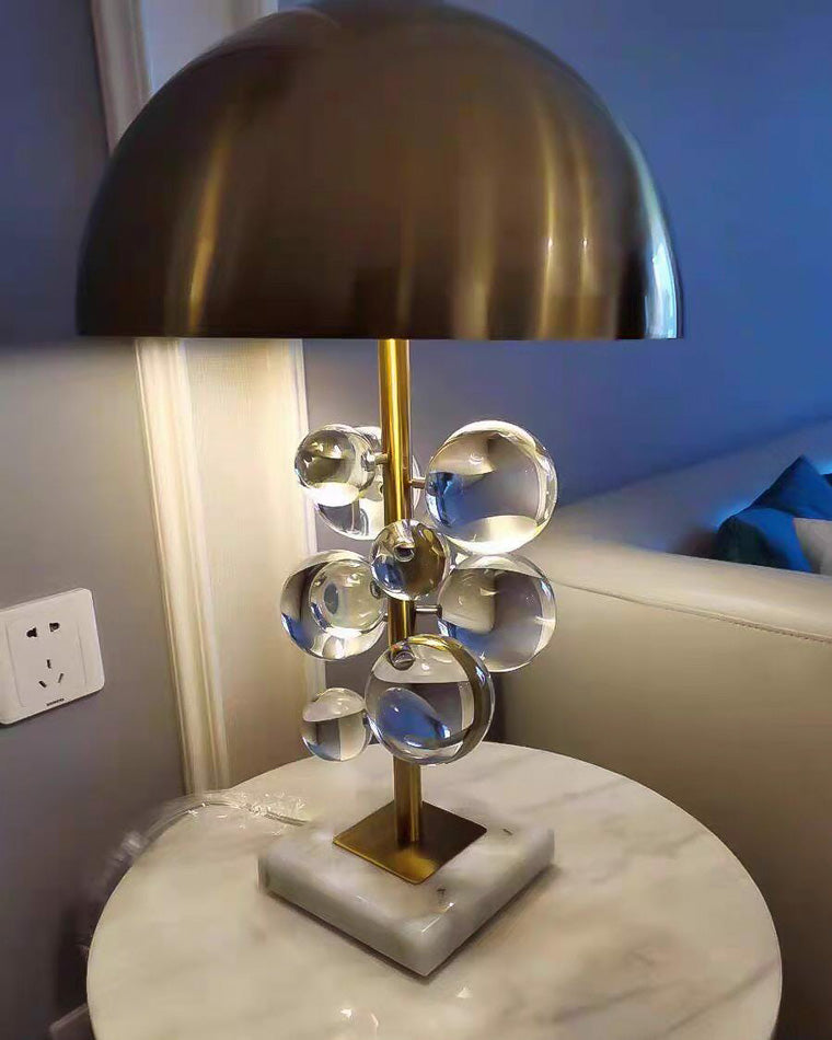 Float into our world of dreamy orbs and cabochons. A constellation of acrylic spheres floats on a slim brass stem anchored by a sculptural marble base and topped with a brass dome. The shade refracts the light, makes the orbs sparkle, and creates a warm glow. Choose clear for a soupçon of hard glamour or opt for the carefully choreographed jewel-toned clusters. The sculptural Table Lamp will resuscitate conventional interiors.