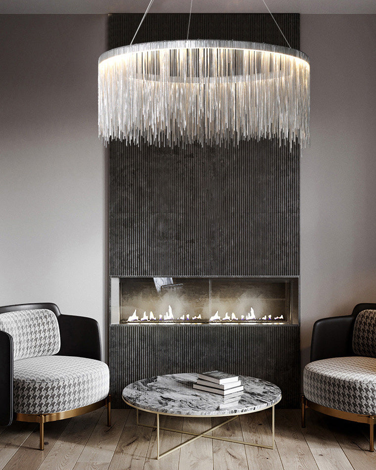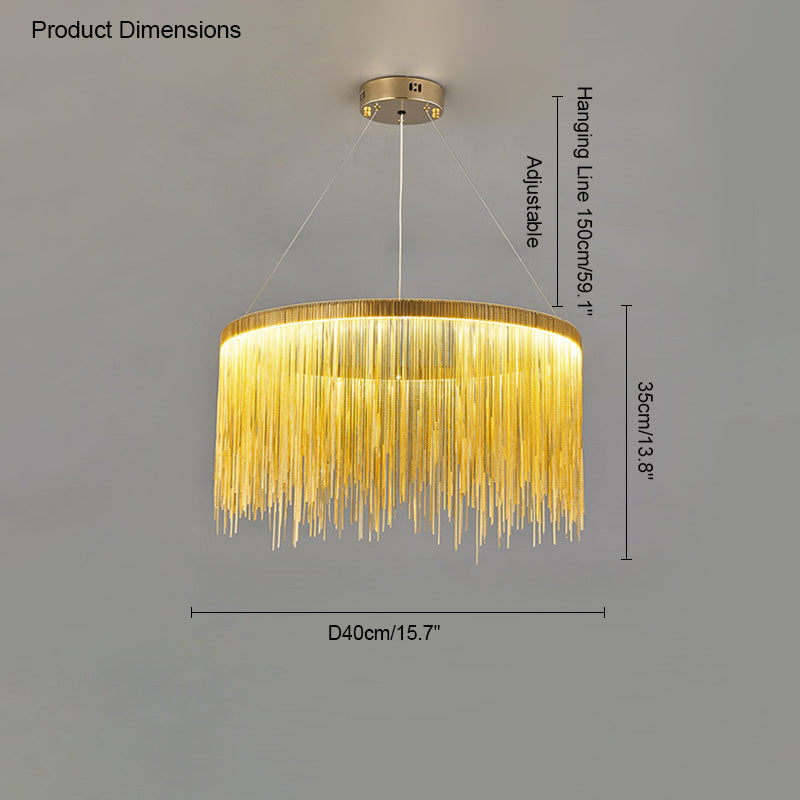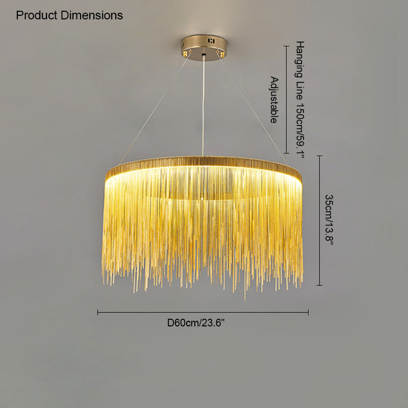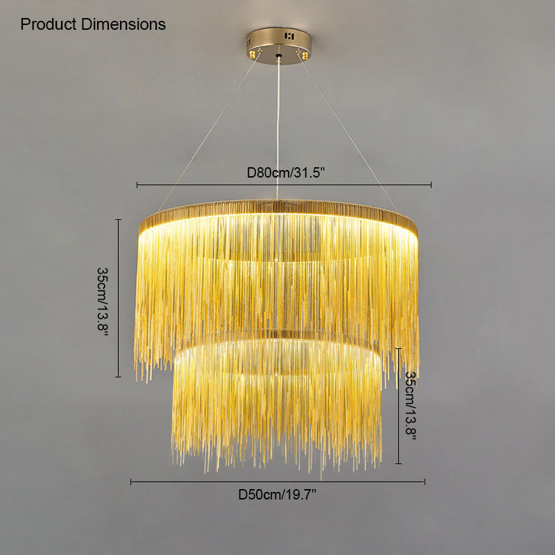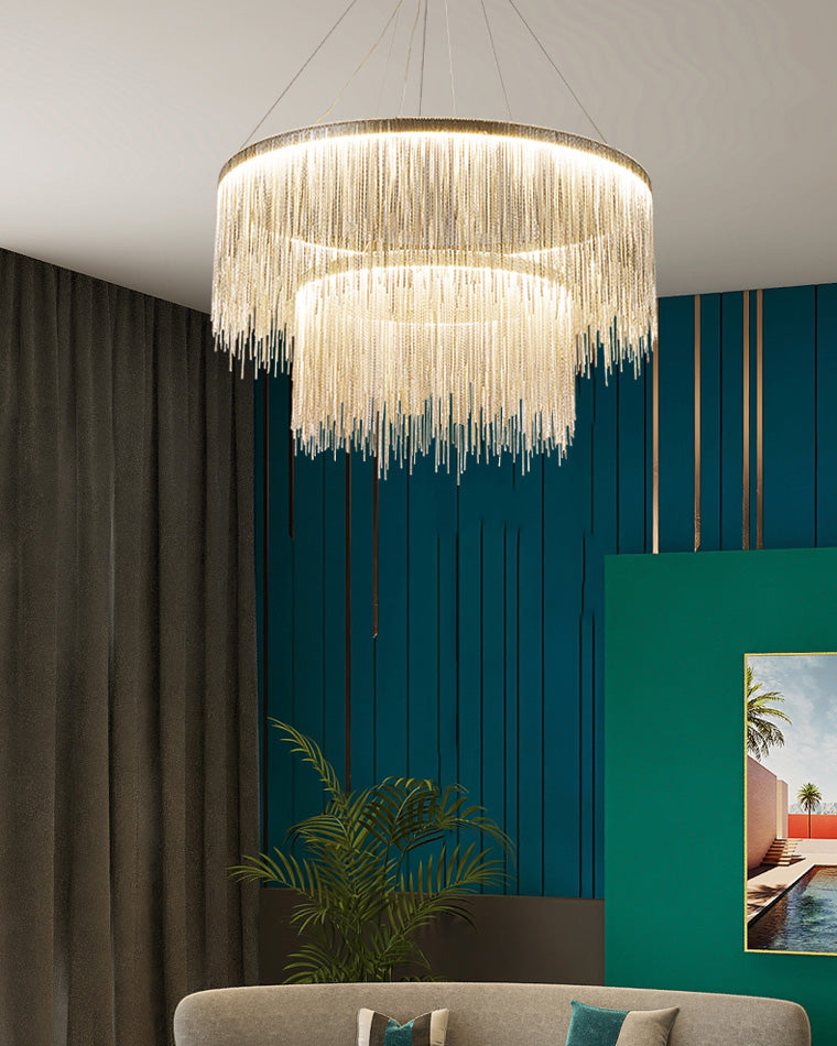 The luxury tiered fringe circular chandelier is an exquisite blend of modern design and artistic craftsmanship. This light fixture offers luxury and grandeur with its contemporary design, elegant circular and linear lines, and intricate decorative accents. Illuminate your home in style with this magnificent statement piece.