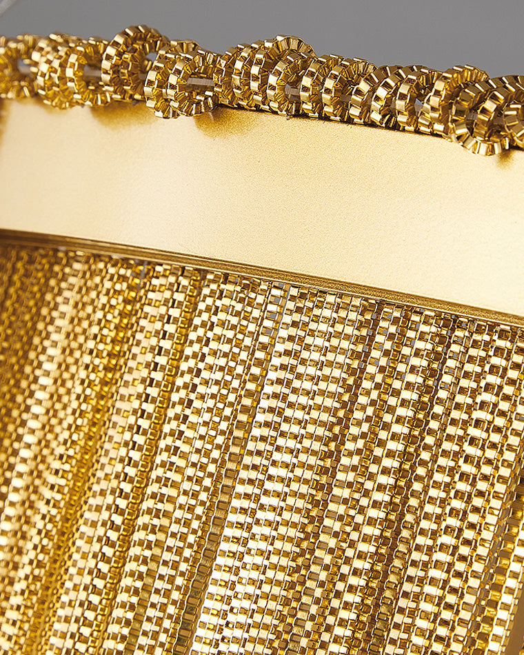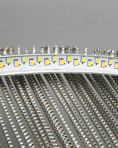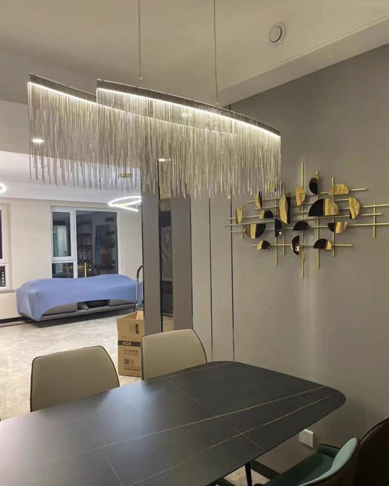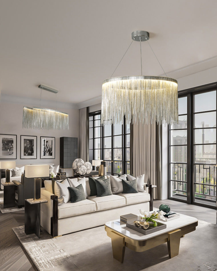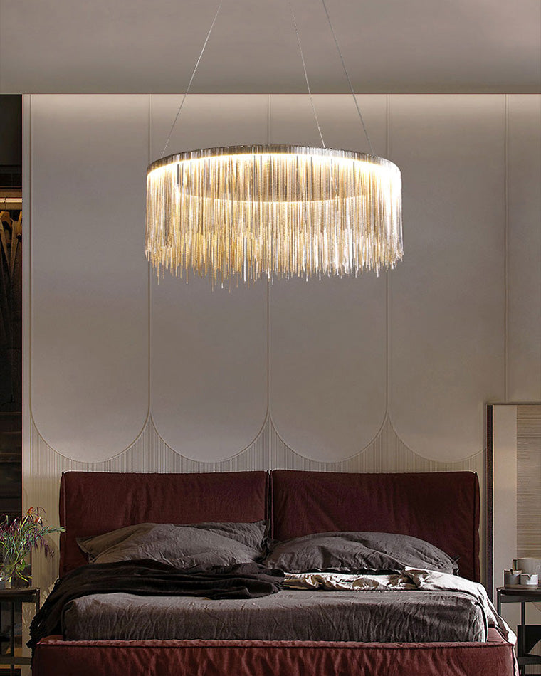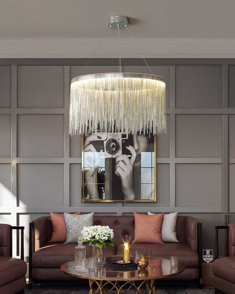 The luxury tiered fringe circular chandelier is an exquisite blend of modern design and artistic craftsmanship. This light fixture offers luxury and grandeur with its contemporary design, elegant circular and linear lines, and intricate decorative accents. Illuminate your home in style with this magnificent statement piece.